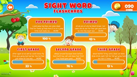 One of the most effective and powerful reading tools that parents and teachers can help children to develop is sight word recognition. By encouraging children to memorise these common and frequently used words as a whole, children can automatically recognise the words in print without having to use strategies to decode. 200 Plus Sight Words app contains over 200 sight words, grouped into 5 grades; Pre-primer, Primer, First Grade, Second Grade and Third Grade, and a reward system to encourage your child to reach their goal.
