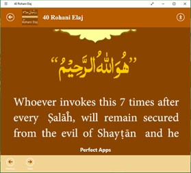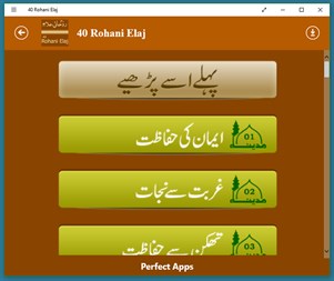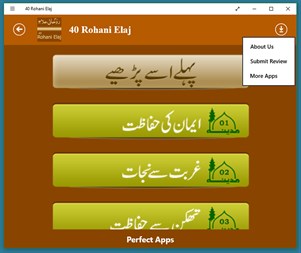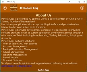 Perfect Apps is presenting 40 Spiritual Cures, a booklet written by Amir-e-Ahl-e-Sunnat, founder of Dawateislami. Use this easy Application with an eye catching interface and persuade other Islamic brothers and sisters to do the same. Perfect Apps is Software development Company. It is specialized in providing software products as well as custom application development service through a wide variety of fields including Manufacturing, Trading, Education, Shipping and Accounts. Perfect Apps Software Solutions: * Point of Sale (P.O.S) with Bar code * Accounts Management * Trading Distribution Management * School Management * Ticketing Management * Payroll System * Biometric Solution Send your valuable opinions and suggesstions on following email address: perfectapps1112@gmail.com