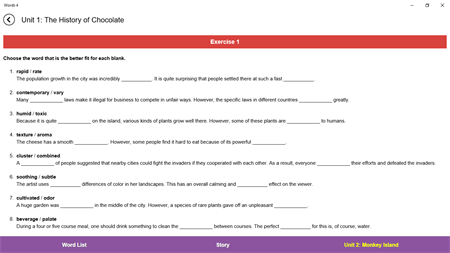 The activities in "4000 Essential English Words" are specially designed to make use of important learning conditions. Firstly, the words are introduced using sentence definitions and an example sentence. The activities that follow in the units encourage learners to recall the meanings and forms of the words. Some activities also make the learners think about the meaning of the words in the context of a sentence—a sentence different from the sentences that occurred in the introduction of the words. Moreover, each unit ends with a story containing the target words. While reading the story, the learners have to recall the meanings of the words and suit them to the context of the story. Such activities help learners develop a better understanding of a common meaning for a given word which fits the different uses.