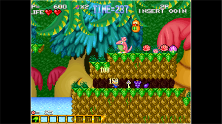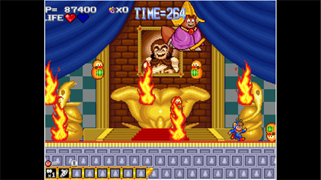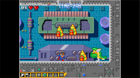 BLUE'S JOURNEY is a side-scrolling action game released by SNK in 1991. In order to save the planet Raguy from the invasion of the Daruma tribe, the hero Blue must fight using leaves, boomerangs, and a variety of other weapons along with his special ability to change his body size. The branching stages allow you to enjoy the game again and again.
