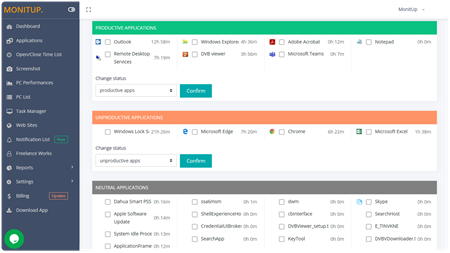With MonitUp, managers can track their team's app and URL usage, categorize apps as productive or unproductive, and monitor work hours. They can also take screenshots of employee screens and generate productivity reports based on app usage and working hours. MonitUp is ideal for companies with remote teams, as it provides real-time monitoring and insights into employee productivity, no matter where they are working from.