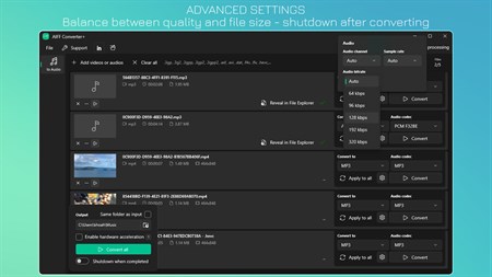 • Enable hardware acceleration to save time. • Auto shutdown when completed. • Save time with multiple files processed at once or focusing on a single video. • Keep PC awake while processing.