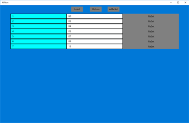 GetNumberボタンで遷移した画面でAllReSetボタンを押下すると表示されている全ての表示内容が変更されます。 表示されている行の右に表示されているReSetボタンを押下すると、その行に表示されている数字が変更されます。 表示された内容は、AllReSet、Loadボタンを押下するまで維持され、メニューに戻って再度、GetNumberを押下した場合、その先のSettingからGetNumberに戻って来た場合も維持された内容が表示されます。 また、アプリを終了しても維持されます。 ただし、Settingで内容を変更した場合は維持されません。