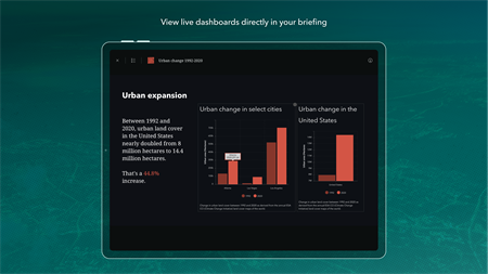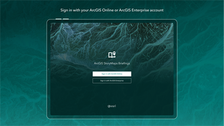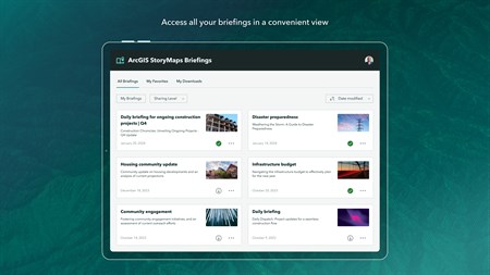 The ArcGIS StoryMaps briefings app enables you to access and share your briefings on the go from your tablet or windows computer, providing a presentation experience at your fingertips. Download your briefings to the app and discover the power and convenience of offline presentations with dynamic maps and 3D scenes.