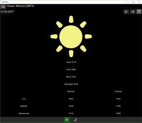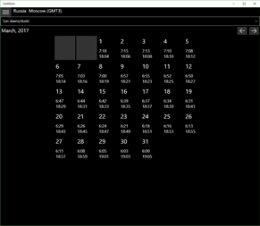 Sun and Moon calendar for day and month. Shows sun's dawn and dusk time, civil, nautical and astronomical twilight, length of daylight. Moon's dawn and dusk time and phases, new moon and full moon dates. App has location and timezone autodetection (use device geoposition function and Internet for town name). You can customize your locations by coordinates and timezone.