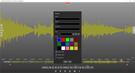 ## Features ## - Change pitch and tempo (speed, time-stretch) independently and in realtime using time and frequency domain algorithms. - Create range and position markers. - Loop and select regions. - Export/share and import songs with annotations (for instance for for sharing between music teachers and students). - Playlists. - Video view* with zoom support (for instance to get an exact view on a guitar player's hand). - Text view with auto scrolling and monospace font support (e.g. useful for tabs). - Subtitles view to show subtitles (for instance for karaoke). - Image view with zoom support (for instance for displaying scores in image format). - Volume amplification, and simple voice reduction. - Channel selection (left/right). - Import various formats including mp3, wav, m4a, ogg, aac, mp4 video,... - Export modified audio to wav, m4a, and flac. - Batch conversion of files (multithreading support). - Record audio directly in the app. - Frequency conversion (for instance to 432Hz).