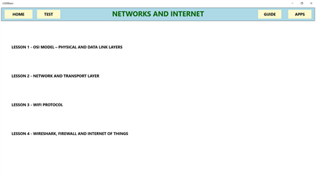COMPUTER SCIENCE LEVEL 9 The various tutorials present the subjects listed below in a practical way through real examples. It also analyzes issues in an interdisciplinary manner. These apps are available from the Windows Store. COMPUTER SYSTEMS ONE – history, bit and byte, arithmetic operations, logical operations, combinatory logic, clock, flip-flop, computer hardware, assembly language and computer files. Tests - 100 questions by topic, 20 questions randomly select and 40 questions randomly selected. COMPUTER NETWORKS ONE – OSI model, physical layer, data link layer, network layer, transport layer, wireless network, network layer services, transport layer services, Wireshark and Firewall. Tests - 80 questions by topic, 20 questions randomly select and 40 questions randomly selected. COMPUTER DATABASE SQLITE – history, database project, creating a database, inserting data, optimizing the code, updating data records, inserting and deleting, show records, SQL commands and data structure. PROGRAMING SMALL BASIC – installing Small Basic, algorithms and programming, variables and operators, statements, turtle – comparing with Scratch, text window and text commands, graphics window commands, file commands, other commands. Tests - 80 questions by topic, 20 questions randomly select and 40 questions randomly selected. BASIC FOR COMPUTER SCIENCE – LEVEL 9 ARDUINO FOR COMPUTER SCIENCE – LEVEL 10 By 2021 – RASPBERRY FOR COMPUTER SCIENCE – LEVEL 11