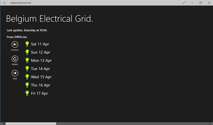 The application collects the information for you and is connected to #OffOn.be and #EliaCorporate tweets. So you can follow the information about the Belgium Grid directly. A graph of the prevision and current load is available and help you to see the electricity need in Belgium.