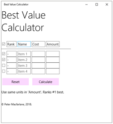 Compare shop items quickly and easily to find out the 'best value'. No more wasted time doing math in your head. Quickly ranks the best item. Don't be confused anymore by manufacturers changing their product sizes and cost