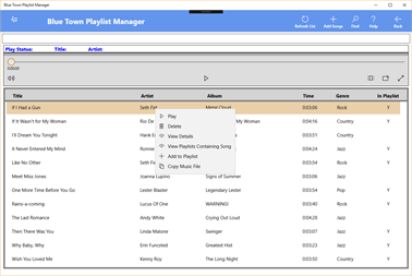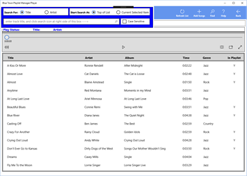 Songs may be imported into or exported from the Blue Town Music Library. A song’s music properties such as title, artist, album, and genre can be edited. Easily keep track of all playlists that a song appears in. Search the Music library for songs and artists.