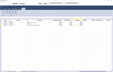 Summaries are generated from the income and expense budget details. The details are summarized by Category, Description and Date. The summaries allow you to see by category Budget versus Actual to see what difference exist at that level. The user can expand the Category grouping to display summary by Category and Description. If desired, the Description grouping can be expanded to display the data summarized by day.