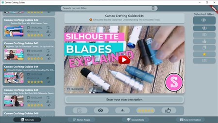 Delve into our vast library of over 300 tutorial videos, meticulously crafted to empower Silhouette Cameo users at every skill level. Our interactive platform goes beyond passive viewing, offering users the ability to actively engage with each tutorial. Customise your learning experience by maintaining personal video descriptions, star ratings, and favourite statuses. Utilize the "Work In Progress" feature to seamlessly navigate through frequently revisited lessons, saving valuable time. With our intuitive search and filter options, finding the perfect tutorial for your needs is effortless. Additionally, our app provides interactive elements such as note-taking capabilities, enabling users to annotate their learning journey and link notes to relevant resources. Whether you're a beginner eager to master the basics or a seasoned pro seeking to expand your repertoire, our app offers a dynamic and immersive learning experience tailored to your individual preferences. Embark on a journey of creativity and mastery with our Silhouette Cameo tutorial app today!