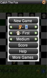 Catch The Fox played by two opponents, on opposite sides of a board, alternating moves. The fox moves forward and backward (diagonally) and needs to reach opposite side. The dogs can move only forward and need to corner the fox.