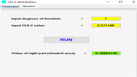 This program calculates the value of the right part for points of a CHI-2 distribution curve. We must indicate the value of CHI-2 and the number of degrees of freedom. The shaded curve represents the value of the right part of CHI-2.