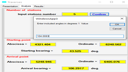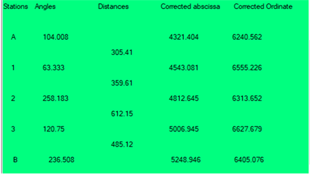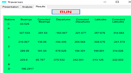 This program calculates the bearings of the lines and the coordinates of the stations of a traverse knowing the internal angles, the lengths of its lines, the coordinates of starting and arrival stations and the starting and arrival bearings. The angular misclosure is distributed uniformly over all bearings except the known bearings (departure and arrival). The closing deviation with the coordinates of the end is adjusted by the method of proportional parallels.