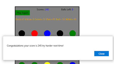 Click any ball as many times as you want. It will generate a random color. Each colour has an amount of points associated with(Black=0 Yellow=5 Green=33 Blue=45 Red=-55 White=10). You have 20 balls to play in total. Click the "Play Again" button to replay without closing down the game. You can click on the "Play Again" button to play again from at fresh any time you want. You get the score per game at the end of each game. Then click "Close" in the pop-up window to close the window.