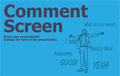 To a more interactive presentation. You can give a presentation while talking with The audience since their comments appear over your screen. A presentation which is unilateral becomes interactive using CommentScreen. Your presentation does not make the audience boring. The audience feels a sense of closeness. The audience can post reactions of the presentation using emojis. The whole audience of venue will be excited depending on posted reactions.
