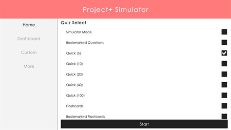QUICK EXAM Allows you to quickly start a 5, 10, 20, 40, 50 question exam with randomized questions.