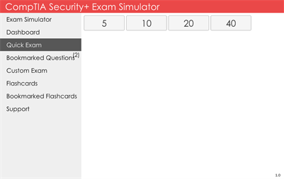 QUICK EXAM Allows you to quickly start a 5, 10, 20, 40, 50 question exam with randomized questions.