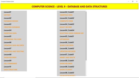 This course is the first Course in Data Analysis in the Area of Computer Science. The major areas in Computer Science are: 1. Computer Systems a. Level 9 - Computer Systems One – in Store b. Level 10 - Arduino for Computer Science - in Store 2. Network & Internet a. Level 9 - Computer Networks One – in Store b. Level 10 - Arduino for Computer Science - in Store 3. Data Analysis a. Level 9 - Computer Database SQLite – this app b. Level 10 - Arduino for Computer Science - in Store 4. Algorithm & Programming a. Level 9 - Programming with Small Basic – in Store b. Level 10 _ Arduino for Computer Science 5. Impacts of Computing a. Level 10 - Arduino for Computer Science - in Store