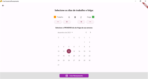 Application made to view and create work schedules (relays). To create your relay schedule, simply select the type of relay, for example: 6x2, 3x1 and 1x1, then select the day of your first day off of the week (it can be any week). Okay, now you will see your annual work schedule.