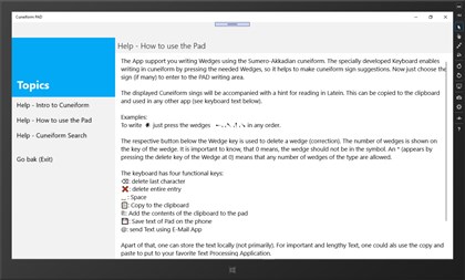 a) A unique genuine Keyboard for writing cuneiform (no letters). b) Help with writing with signes (syllabary - phonograms) to create Sumero-Akkadian cuneiform texts, to use them in other apps or to send them as emails. c) The entire cuneiform character set can be searched, filtered, viewed and used to generally write a cuneiform text or to transfer it to the pad.