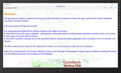 Cuneiform PAD / Keilschrift PAD / لوحة الكتابة المسمارية This App aims at scholars, students as well as any body interested in Cuneiform writing. The signs used are the Sumero-Akkadian Cuneiform Unicode standard.