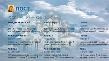 В приложении информация о постах, которые испокон веку на Руси соблюдал каждый уважающий себя человек и которые мы с вами сейчас только только учимся вести по настоящему, правильно, с доброй пользой для себя – физической и духовной.
