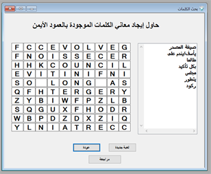 برنامج تعلم المفردات يهدف إلى تعليم مفردات اللغة الإنجليزية عن طريق الالعاب التي تساعد على حفظ كتابة وقرائة ومعنى هذه المفردات. يحتوي هذا البرنامج على أربعة ألعاب هي كالتالي: 1. لعبة البحث على الكلمات 2. لعبة الكلمات المتقاطعة 3. لعبة السرعة 4. لعبة الإختبار كما أنه يحتوي على نوافذ تساعد المتعلم على دراسة هذه المفردات عن طريق كتابة الكلمة باللغة الإنجليزية لحفظ طريقة كتابة هذه الكلمة وأيضا تساعد هذه النوافذ على كتابة معنى الكلمة لحفظ معناها بالإضافة إلى الاستماع إلى نطق الكلمة حتى يتمكن المتعلم من معرفة طريقة قراءت هذه المفردات.