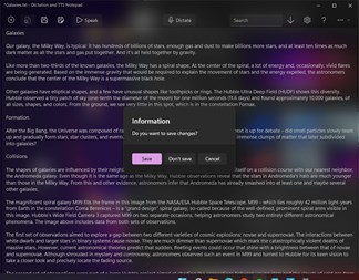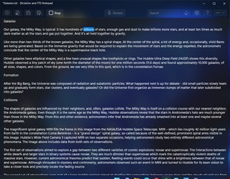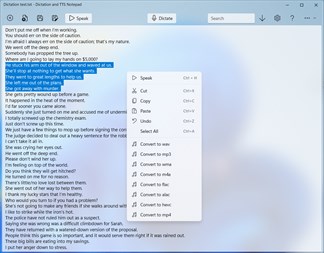 Notepad with speech to text (dictation), text to speech (TTS) and text to audio file capabilities. You can dictate short or lengthy narratives with punctuation marks, read whole or selected text aloud and convert text to audio files (wav, mp3, wma, m4a, flac, alac, hevc, mp4 and wmv).