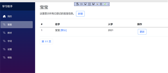 1. 登记宝宝 -> **选择一个宝宝**用于稍后的记录和分析; 2. 新建教材 -> 导入教材字库 -> 为刚刚选择的宝宝**选择一个教材**用于稍后的记录和分析; 3. 查询字词 (基于刚刚选择的宝宝和教材字库) -> **添加听写记录**(或者批量导入); 4. 查询字词 -> 按照错误频率 或者 听写次数过滤等(根据上一步产生的听写记录) -> **筛选和反复听写易错字词**。
