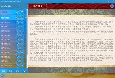 This application contains four of classic article of moral education in ancient China: 《名贤集》、《增广贤文》、《孝经》、《二十四孝》, each provide human read audio, comments and translates. Not only can be used for moral education of children, interpersonal and self-cultivation for adults is also has very good guidance.