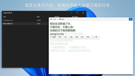 • 自定义练习 - 你可以输入你想要练习的任意内容,使用自己想要练习的任意输入法——不仅限于拼音输入法,还可以是五笔、双拼等输入法,通过选词、回退修改等操作,进行更真实的打字训练。软件提供计时和错误计数功能。 - 所有内置篇目也提供自由模式,以练习中文输入法输入和英文自由输入。