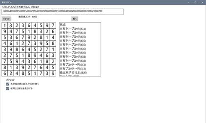 数独を7種の解法で解くことで、問題の難易度のスコアを算出します。 点数が高いほど解くのに手間がかかることを表します。 7種の解法で解けなかった場合は総当たりで解きます。