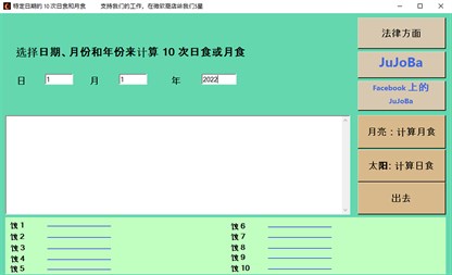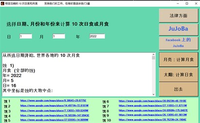 确定给定日期以来 10 次日食和月食的日期、类型和中点位置。 日期可能是从我们这个时代的11年,到我们这个时代的3003年。 它会自动为每个 Eclipse 生成一个链接,该链接将通过您的 Web 浏览器将您带到 Eclipse 的中点。 您唯一需要输入的是日期。计算将由此自动进行。