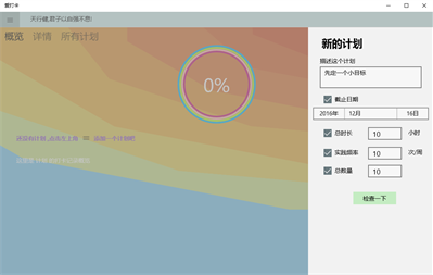 懒癌患者是无救的! 设计一个计划,按时打卡,获取成就吧o(*^▽^*)┛ 目前支持按截止日期,总时间,频率以及数量来制定计划,选项可以任意搭配! pc端和手机端通用,但是不支持数据同步(╥╯^╰╥)