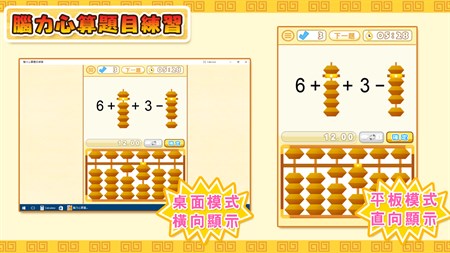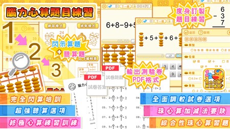 腦力心算題目練習(繁體中文,粵語/國語發音),提供珠心算訓練的閃示(暗算)及聽算題目。同時提供針對珠心算的四個加法要訣及四個減法要訣的題目鍛鍊。