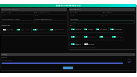 An app to provide a modern and configurable way to check that your passwords are secure. Simply select the requirements for your password and enter the password you would like to use. Then, the app will check a variety of weak password techniques and provide your password with a score and color indicator to easily understand its strength.
