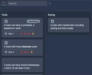 An easy to use Org mode Editor and Agenda for handling Todo lists and notes. A complete personal Project Management tool. At the start of the day, see what's the most important tasks today. Log detailed closing notes about how you solved each todo for future reference. Agenda view, Calendar view, Kanban Board, statistics and more. Advanced search capability to search on dates and date ranges, types of notes, tags etc. Easily create weekly reports as you can quickly find what Tasks you have finalized during the specified reporting period.