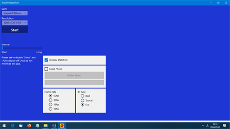 If you need to select fps of output file, you can select fps in 60,30,15,or 10. Trial period is 30 days. When you use this app, please allow the use of the camera and microphone. Permission to use the camera and microphone can be set in the Settings -> privacy of windows10. Note:This app can not take 4K resolution movie,But FullHD or lower resolution are supported. This app can make image files of whole scene which files divided folder by hour. And This app can select bit rate of movie.