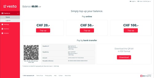 From your PC, you can top up your user balance by the following means: credit card (Visa, MasterCard, American Express, UnionPay), e-banking, PostFinance, TWINT, WeChat Pay, PayPal or by QR-bill.