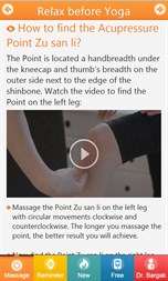 √ Exercise Yoga More Effectively using Traditional Chinese Massage Points √ Easily find the right Massage Points with simple Full HD Videoclips and Photos √ Never forget a Massage with a built-in Reminder