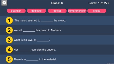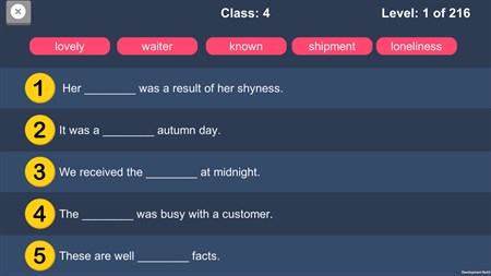 We have added 8 different classes with easy to hard level. There are 10,000 sentences are included. It also helps you to learn fill in the blanks. You learn how to use word grammatically in sentence.