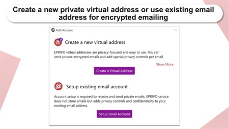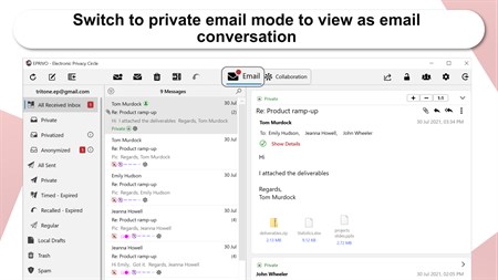 Much more than just encryption, EPRIVO is the only collaboration and private email service with a range of fine-grained privacy controls and autonomy - allowing future control in both recipient devices and cloud. EPRIVO virtual addresses are privacy-focused and easy to use. Emails are stored encrypted with zero-knowledge encryption, for your privacy. It also enables you to send private emails with controls using your existing email address (IMAP accounts - Exchange accounts require IMAP access enabled). The service does not store such emails, but combines government-grade digital security/encryption with patented Physical Security to ensure each message’s privacy in the future. No single provider has access to all the content even in encrypted form.