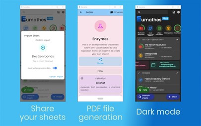 Many other features await you in Eumathes: revision reminders, import of sheets, export and sharing, generation of PDF files, etc. Don't wait any longer, install it!