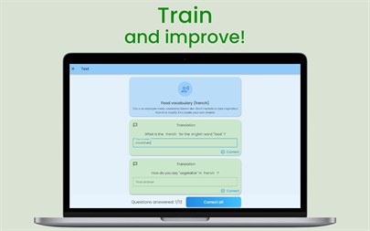 - Train and progress - You can assess yourself on a test, with a unique and personalized series of questions. The tests are customizable according to your preferences, and allow you to follow your progress over time: the key is consistency!