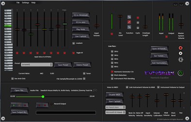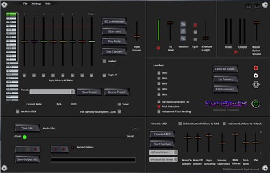 The Euphorion Harmonic Equalizer is a powerful audio tool, which is used to isolate and amplify individual harmonics of musical notes in real time. The application detects the note being played at the input and equalizes the audio according to the chosen harmonics. Additional harmonics can also be generated and added to the audio up to the 33rd Harmonic and sub-harmonics down to the fundamental frequency divided by 6.