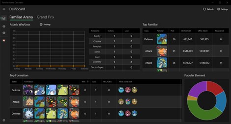 Effortlessly Log Your Battles: Record your Familiar Arena and Grand Prix results seamlessly, unveiling detailed insights such as: *Top Familiar Table: View critical stats including Class, Familiar, Pick, AVG DMG Dealt, Taken, and Recovered. *Top Formation Table: Explore Battle Types (Defense or Attack), Familiar Team Formations, Win-Loss Ratios, and most-utilized skills. *Popular Element Pie Chart: Visualize frequently used elements for enhanced planning strategies.