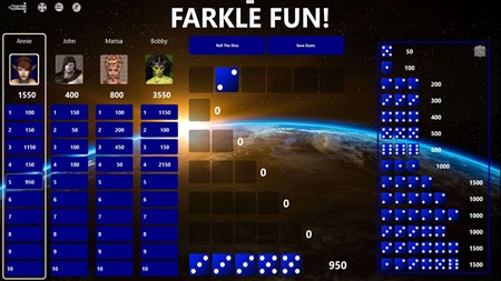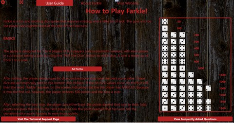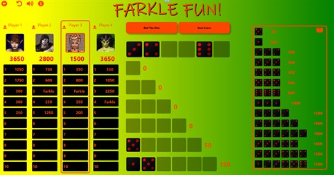 Common scoring combinations are shown in the game on the right panel, but there too many other scoring combinations to show them all. If the remaining dice rolled can not make a scoring combination, then the word “Farkle” appears on the screen indicating that the the player has FARKLED and forfits all points for that turn. Once in a while, the player manages to use all six dice (either in one or several rolls). When this occurs, it is known as “Hot Dice” and the player is allowed to roll all 6 dice again, adding to the score. If the player farkles in any of these bonus rolls, all points for that turn are lost.