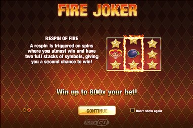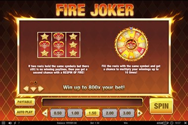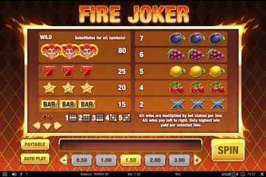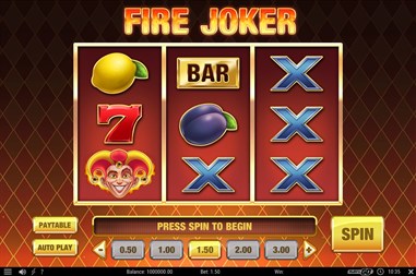 The reels can set fire at any moment in Fire Joker, a 3-reel video slot game. Things can get a little heated when a combination of three matching symbols align in any horizontal or diagonal pay line. The devilish Fire Joker is a wild symbol that can appear in any position on all three reels, where it substitutes for all normal symbols to help comprise winning combinations.